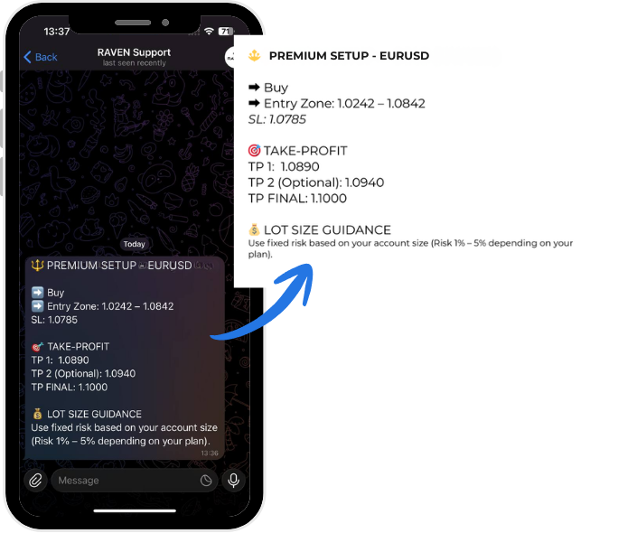 Clean Entry, SL, TP1–TP Final structure for every trade.